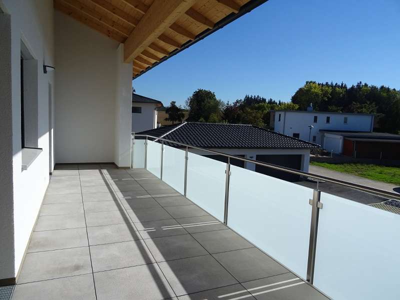 Loggia- und Freiflächenabschlüsse: Verbundsicherheitsglas satiniert mit aufgesetztem Nirohandlauf auf verzinkter Unterkonstruktion. Farbe entsprechend Farb- und Materialkonzept